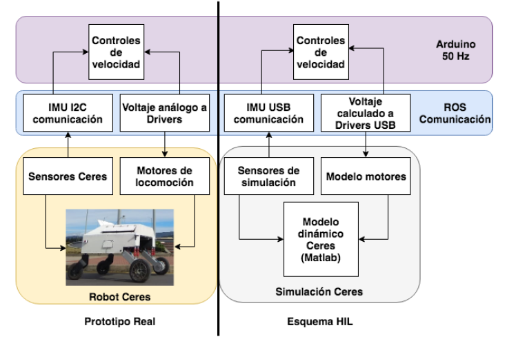 La prueba de los controladores se realizó con el uso del entorno ROS (Robot Operating System) el cual permite modularidad entre diferentes sensores y actuadores. Los controladores de bajo nivel se programaron en un Arduino Mega el cual se conecta por comunicación serial al computador principal que corre el nodo principal de ROS y Matlab conectado a la red ROS de forma que se integre el modelo del robot desarrollado. En esta subsección se describe la simulación y el flujo de datos que permite la interconexión ROS-MATLAB-Arduino para la simulación HIL.
