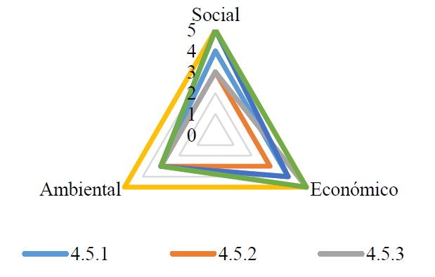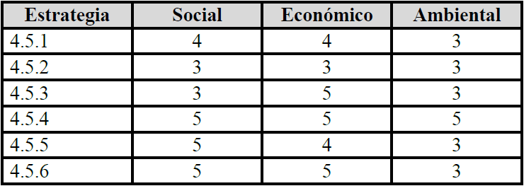 Con el fin de comparar el impacto que las estrategias propuestas tienen sobre la implementación del SLI, en la Tabla 6 se califica en una escala de 1 a 5 el impacto que generaría cada estrategia sobre los tres ámbitos de la sostenibilidad, siendo 5: Positivamente en el medio-largo plazo; 4: Positivamente en el corto-medio plazo; 3: no afecta; 2: Negativamente en el corto-medio plazo y 1: Negativamente en el Largo-medio plazo. Con esta información es posible determinar en qué posición se encontraría el sistema, si logra sostenibilidad en estas temporalidades. En caso de que las estrategias impacten negativamente alguno de los tres aspectos que integran la sostenibilidad, se caracteriza si este impacto es en el corto plazo, medio plazo o a largo plazo. Lo ideal es disminuir los impactos negativos, más aún en el largo plazo y que las estrategias se ubiquen en el extremo superior o en el extremo derecho, indicando una consecución de sostenibilidad.
