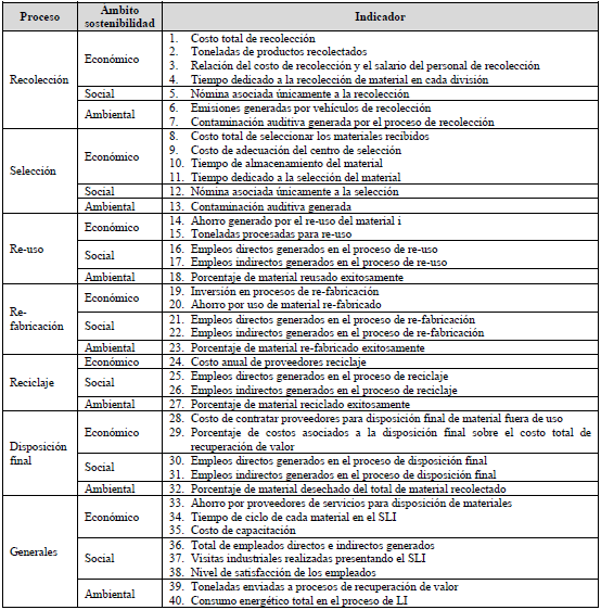 En función de lo analizado en la literatura, es posible proponer un conjunto de indicadores que permitan hacer trazabilidad al Sistema de Logística Inversa propuesto, éstos se agrupan en función de las etapas propuestas y las actividades que las conforman. La tabla 7 presenta un conjunto de indicadores para realizar trazabilidad al Sistema de Logística Inversa propuesto, estos indicadores se asocian a los tres ámbitos del desarrollo sostenible: el aspecto económico, el aspecto social y el ambiental.