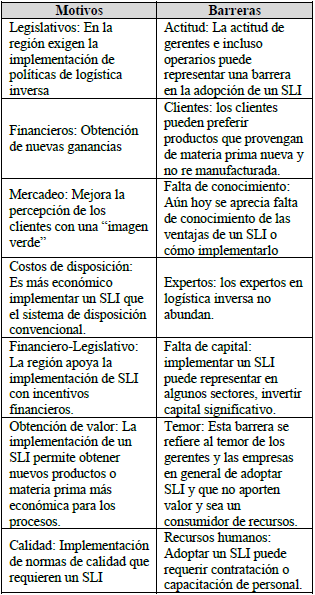 La formulación de redes de logística inversa ha permitido identificar las motivaciones y posibles barreras para la implementación de un SLI; la Tabla 1 resume estos factores.