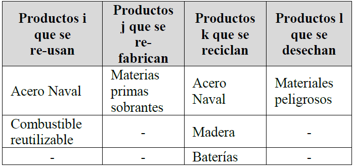 En el SLI propuesto, las flechas continuas indican flujo de materiales, mientras que las flechas punteadas indican flujo de información. Los indicativos i, j, k y l representan los materiales que ingresas a los diferentes procesos para recuperación de valor en toneladas, siendo N las toneladas totales que ingresan al sistema. La etapa de recolección requiere que desde el astillero se garantice el cumplimiento del manual para residuos generados o se sigan las disposiciones de la ley. Durante la recolección se debe garantizar que los materiales residuos de procesos productivos no se contaminen y que los materiales que ya han sido usados y pueden generar contaminación, sean manipulados adecuadamente. Esta primera etapa está a cargo de Varadero, ya que es la instancia responsable del centro de acopio para el astillero analizado. La Tabla 3 presenta los materiales que se han identificado pueden ingresar al Sistema de Logística Inversa propuesto.