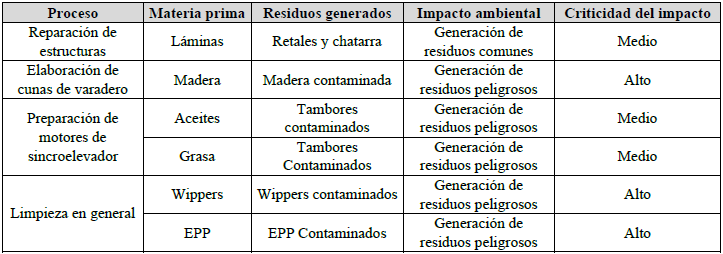 La gestión de residuos del astillero se realiza en el centro de acopio temporal de la chatarra y de otros residuos, donde la operación y responsabilidad para manejo de materiales es del jefe de división varadero. En la Tabla 2 se presenta la caracterización de los materiales generados en esta división y la criticidad de su impacto.