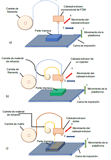 El FDM es un proceso de manufactura aditiva donde un filamento es alimentado hacia un extrusor, calentado por encima del punto de fusión y depositado en una plataforma donde se solidifica y se consolida la parte. El movimiento del extrusor está controlado por un software CNC de mínimo 3 ejes, ver Figura 1 (a). Se han generado desarrollos de impresoras de más de 3 ejes, donde es posible generar impresiones de refuerzos de fibras curvas [24].