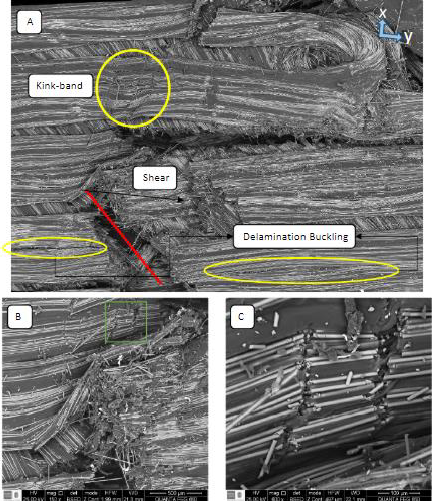 Argüello-Bastos et al. [50], [51] también presentaron la caracterización a compresión de estas piezas, al variar: el tipo de patrón de llenado, la orientación de las fibras y el número de capas de estas. Además, presentaron imágenes de microscopía electrónica en donde se evidencian los mecanismos de daño de compresión como la delaminación por pandeo, fractura de fibras y bandas de pliegue, como se muestra en la Figura 4.
