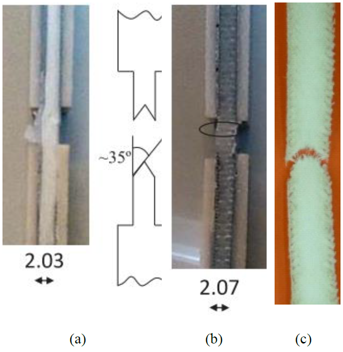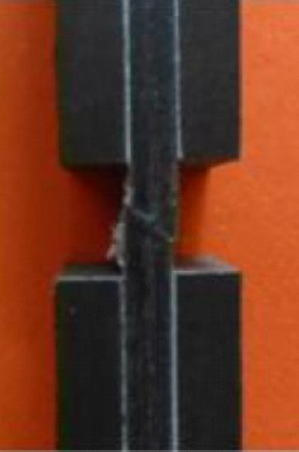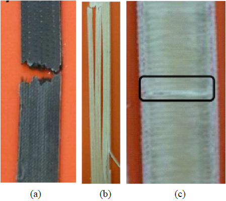La Figura 5 muestra las diferentes tipologías de la falla halladas en ensayos de tracción. Se observa en la Figura 5(a) la falla de la probeta con refuerzo de fibra de carbono orientado a 0°, se trata de una falla translaminar con rotura de fibras en una superficie perpendicular a la aplicación de la carga. La falla, indican los autores, fue explosiva debida al comportamiento frágil que poseen las fibras de carbono. Para refuerzo de fibra de vidrio a 0°, Figura 5 (b), se observa una falla tipo “madera verde”, en donde las fibras tuvieron diferentes regiones de rompimiento, provocado por una menor diferencia de rigideces y además por grietas interlaminares de sentido longitudinal. La Figura 5(c) muestra la falla en una probeta con orientación de fibras a 90°, la falla es debida al rompimiento de la matriz por una grieta interlaminar.