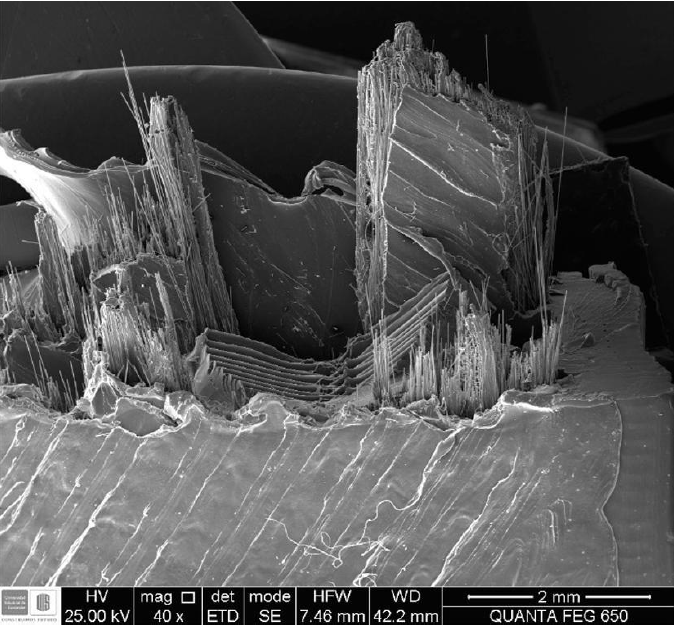 Por otro lado, según como se presentan las fallas en las láminas, se pueden dividir en: fractura interlaminar, intralaminar y translaminar. Interlaminar se refiere cuando existen grietas en la fase de la matriz [59], intralaminar es el desprendimiento de láminas adyacentes [60], también conocido como delaminación. y translaminar implica una falla catastrófica de la lámina y corte de las fibras [61].