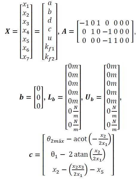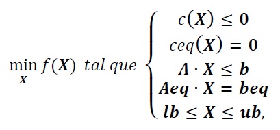 (10)donde, 𝑐 y 𝑐𝑒𝑞 son funciones no lineales que devuelven vectores, 𝑨 y 𝑨𝒆𝒒 son matrices, mientras 𝒃 y 𝒃𝒆𝒒 son vectores los cuales, en conjunto, describen sistemas de ecuaciones y de desigualdades lineales, 𝑿 es el vector de entrada de la función 𝑓 y los vectores 𝒍𝒃 y 𝒖𝒃 son sus límites inferiores y superiores. Todos estos vectores y matrices se definen como sigue:
