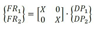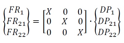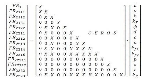 (1)Donde, FR, DP y A son los vectores de requisitos funcionales y parámetros de diseño y, la matriz de diseño, respectivamente. El término de la fila i y columna j de A (Aij) se interpreta como el efecto que tiene el parámetro de diseño j sobre el requisito funcional i.