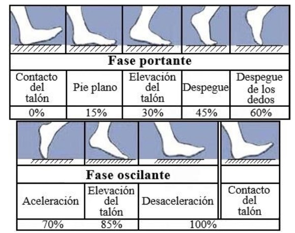 El ciclo de marcha se divide en dos fases: i) portante (ST por sus siglas en inglés), ii) oscilante (SW por sus siglas en inglés). Por su parte, la ST se subdivide en 5 etapas: contacto del talón 0%, pie plano 15%, elevación del talón 30%, despegue 45% y despegue del dedo 60%. Mientras, la SW se subdivide en tres etapas: aceleración 70%, elevación de los dedos 85% y desaceleración-contacto del talón 100%, ver Figura 1.