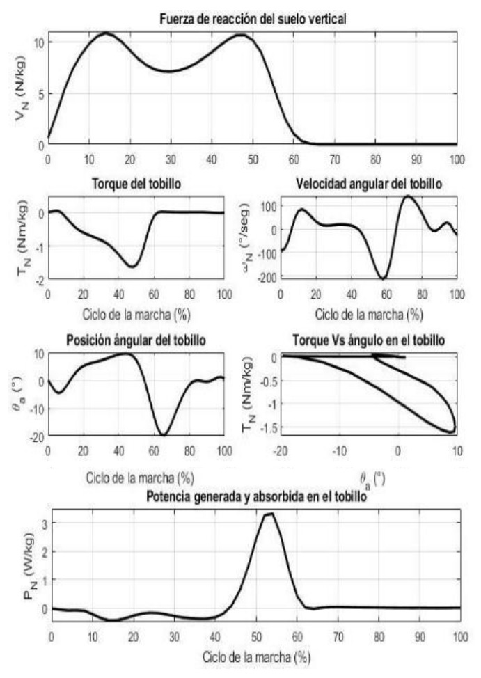 [40]. En esta aparecen las siguientes variables: la fuerza vertical, Vn, por unidad de masa actuante en el pie, debido a la reacción del suelo; el momento torsor, Tn, por unidad de masa al cual se encuentra sometido el tobillo, este es negativo si va en dirección de la flexión plantar. También, la velocidad angular del tobillo, 𝜔, medida en grados por segundo y posición angular del tobillo, 𝜃𝑎, medido en grados, ambas positivas en dirección de la dorsiflexión; la relación no lineal del torque con la posición angular del tobillo; y por último, la potencia generada y absorbida, 𝑃n , por los músculos que controlan la articulación. Según lo anterior, en los requerimientos definidos se determinaron la fuerzas, torques y desplazamientos utilizados para la validación del diseño propuesto en este trabajo.