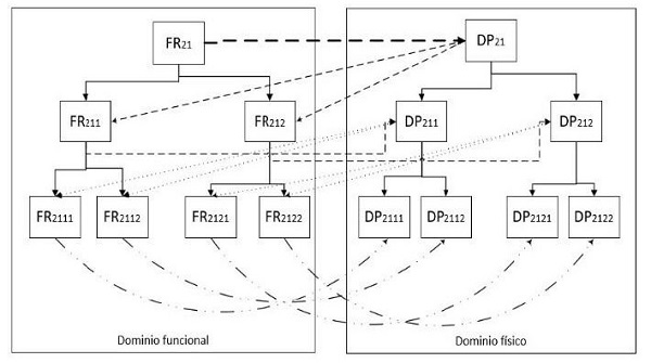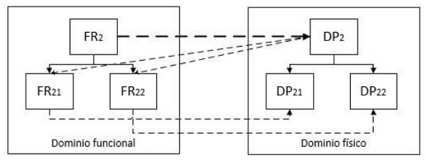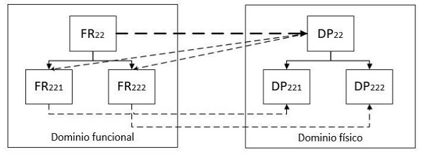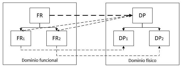 Inicialmente, fue considerado el nivel de mayor abstracción, el cual relaciona los dominios de requisitos, FR, y parámetros de diseño, DP, acorde con la Figura 4.