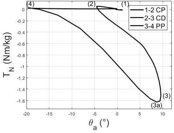 La definición de DP2 se orientó a dar cumplimiento a FR2. Para esto, se consideró el modelo funcional propuesto por Palmer en [45]. Donde, la articulación del tobillo para una marcha horizontal en el plano sagital es considerada como la combinación de elementos mecánicos, tales como: resortes, amortiguadores (elementos pasivos) y actuadores (elementos activos). Siendo la posición y velocidad angular del tobillo las variables de entradas mientras el torque la variable salida. Este modelo fue validado en otros escenarios en [46]. Estas referencias clasificaron la fase ST en tres subfases: i) flexión plantar controlada (controlled plantarflexion o CP), ii) dorsiflexión controlada (controlled dorsiflexion o CD) y iii) flexión plantar motorizada (powered plantarflexion o PP), ver Figura 7. Cada una de las cuales se asoció al comportamiento específico de elementos mecánicos, a saber:
