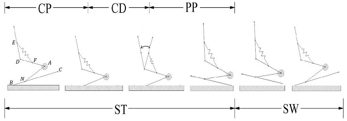 Durante la subfase CD, el resorte torsional mantiene la deflexión con la que finalizó en CP; además, a medida que el eje de la pierna (línea DE) avanza en dorsiflexión el resorte en EF aumenta la rigidez torsional gradualmente en la articulación D (Tobillo D) y un mecanismo de bloqueo, presentado posteriormente, restringe el giro del tobillo A. En la subfase PP, el mecanismo de bloqueo mantiene la deflexión del resorte torsional y el resorte en EF ofrece una propulsión al pie hacia adelante. Por último, en la fase SW el mecanismo de bloqueo se desactiva, permitiendo que la energía almacenada en el resorte torsional se libere reposicionando al pie para un nuevo ciclo de marcha.