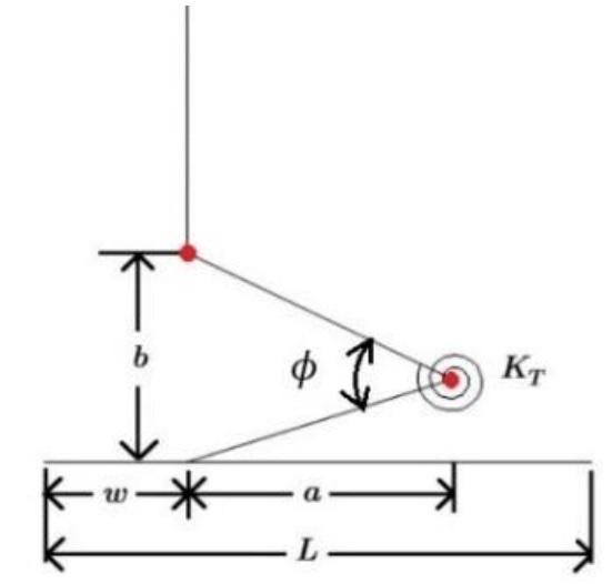 La propuesta conceptual, del mecanismo de reinicio de posición, está integrada por dos barras cuyas posiciones están definidas por los parámetros 𝑎 y 𝑏 y, un resorte torsional, con una constante de rigidez torsional 𝑘𝑇 y un posicionamiento angular de sus brazos 𝜙, ver Figura 10.
