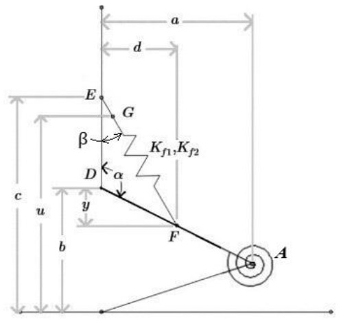 debido al movimiento relativo del punto E respecto a la barra DA. Cuando el punto E alcanza la posición de G, el segundo resorte, con rigidez 𝑘𝑓2, se comprime experimentando un cambio de longitud