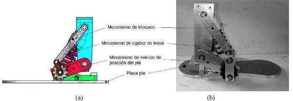 El diseño conceptual fue complementado y generando las especificaciones de las geometrías en los diferentes componentes del mecanismo. El diseño básico del mecanismo pie-tobillo generado se presenta en la Figura 14.