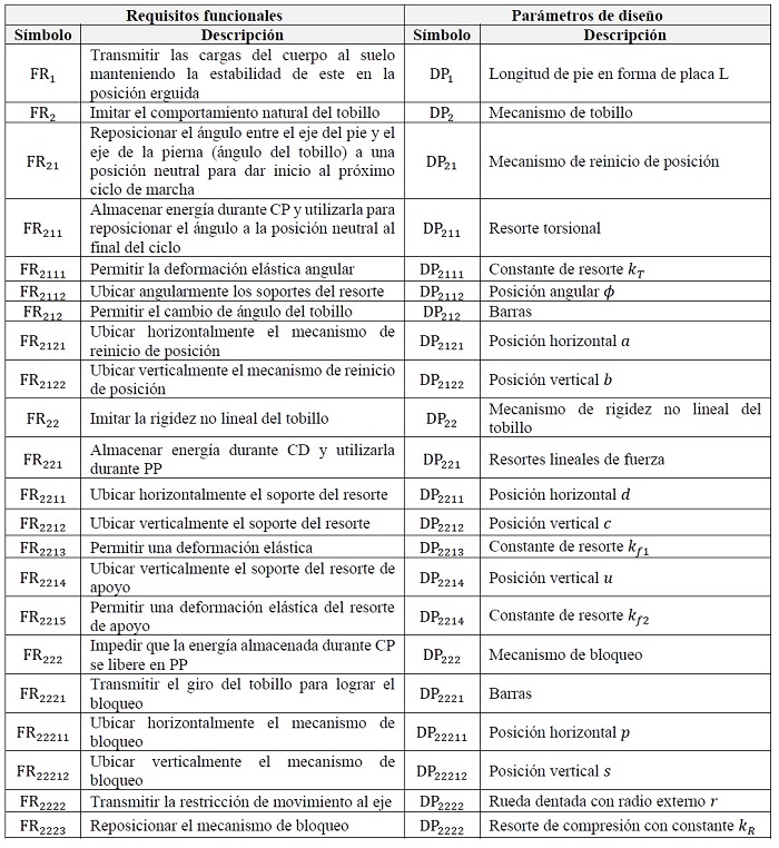 Para el desarrollo de este trabajo, fue definido el requisito funcional de nivel K1, ver Tabla 3. Igualmente, se consideró un peso de 67kg y una altura 1706mm, el cual representa el promedio de la población colombiana entre 30 y 50 años [43]. Paralelamente, la solución se restringió a lo especificado en una prótesis pasiva, para favorecer aspectos de mantenimiento de un grupo poblacional con un nivel socioeconómico limitado, escenario frecuente en Colombia [8]. Por otra parte, fueron definidas como restricciones el peso (< 2.5% del peso del cuerpo) y la altura (18cm) de la prótesis [44]. Así como, los materiales y procesos de fabricación usados debían de ser asequible en el territorio nacional.