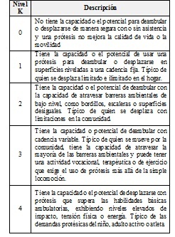 La definición de los requisitos funcionales en una prótesis de extremidad inferior se basa, principalmente, en dos fuentes de información: i) Evaluación de profesionales de la salud apoyados en la clasificación funcional de medicare (Medicare Functional Classification Levels o MFCL), ver Tabla 1 [36]. La valoración de los niveles K se realiza mediante el predictor de movilidad de amputados (AMP por sus siglas en inglés), ver Tabla 2 [37]; ii) Registros experimentales de la evaluación de marcha en laboratorios instrumentados.