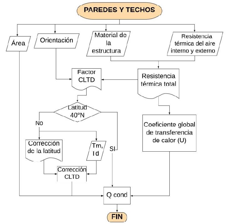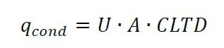 Paredes y Techos: La carga térmica de estos elementos es calculada a partir de factores CLTD, este permite determinar la carga de enfriamiento debida a la ganancia de calor de la estructura, la cual debe ser multiplicada por el valor UA. Donde U representa el coeficiente global de transferencia de calor de la pared o el techo y A es el área de la superficie [17]. Para el cálculo de estos elementos se emplea la ecuación:
