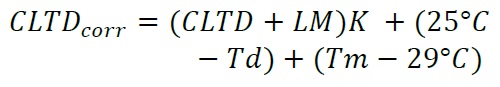El CLTD, se encuentra tabulado para distintos tipos de construcciones y puede ser aplicado directamente siempre que las temperaturas interior y exterior correspondan a 25°C y 29°C, respectivamente [9]. En caso contrario, dicho factor debe ser corregido a partir de la ecuación: