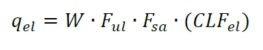 Donde, 𝑞𝑒𝑙 representa la carga de refrigeración a partir de las luces (W), 𝑊 está dada por la potencia total de las lámparas (W), 𝐹𝑢𝑙 es el factor de uso de iluminación (adimensional), 𝐹𝑠𝑎 es el factor de previsión especial para luces fluorescentes (adimensional), y el factor 𝐶𝐿𝐹𝑒𝑙 representa el factor carga de refrigeración debida a la luminaria eléctrica (adimensional).