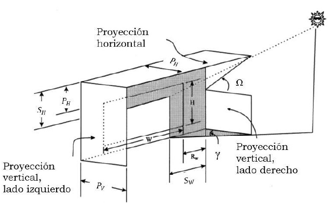 (5)Donde, 𝑃𝐻 representa la profundidad de la proyección horizontal de la saliente sobre la ventana. Igualmente, para obtener el ancho de la sombra que proporciona la pared vertical sobre la ventana se tiene: