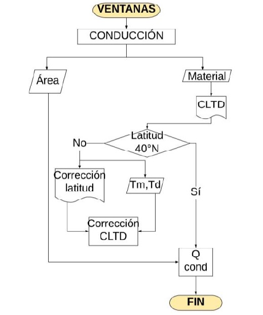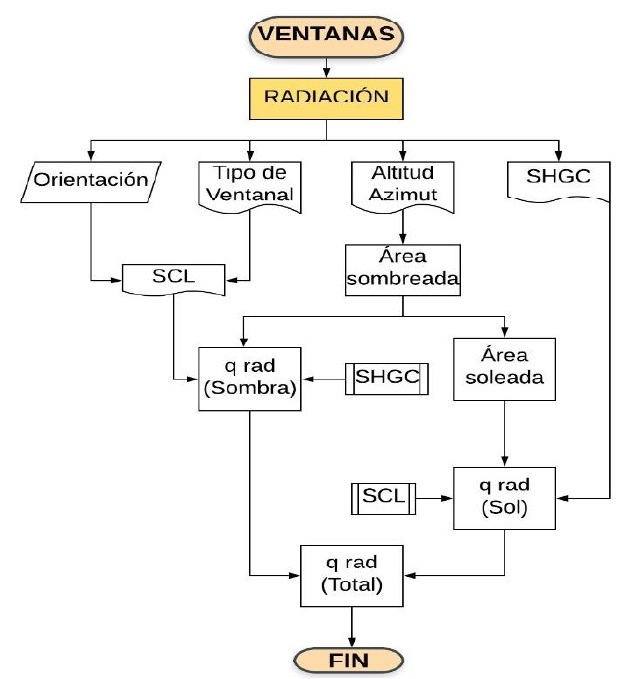 Para la opción de “Ventanas”, los cálculos se realizan en dos secciones, el primer procedimiento comprende la carga por conducción el cual se describe en la Figura 3. El segundo procedimiento corresponde al cálculo de la carga por radiación, dentro de este se contemplan los cálculos para la parte sombreada y soleada de la ventana, dicho algoritmo se muestra en la Figura 4. Finalmente, el software muestra en una tabla la sumatoria de la carga por conducción y por radiación (tanto de la parte sombreada como la soleada) de cada ventana.