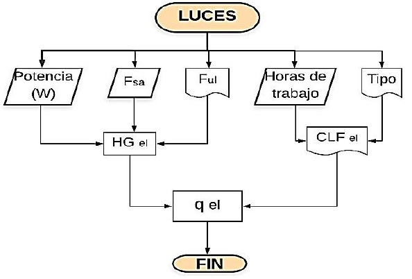 Estos factores dependen de las circunstancias de uso del espacio estudiado, por lo tanto, son conocidos por el usuario. Este factor también puede ser precargado en un formato de Excel, el procedimiento seguido se encuentra mostrado en la Figura 5. El programa finalmente realiza el cálculo del q𝑒𝑙, empleando la ecuación (7) y se muestra en pantalla.