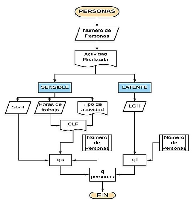 El software sigue el diagrama mostrado en la Figura 6 para obtener la carga térmica total aportada por los ocupantes, esta se representa como 𝑞personas y proviene de la sumatoria de la carga de refrigeración sensible y latente.