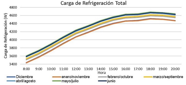 Por medio del software desarrollado se logra obtener la carga térmica total para cada uno de los elementos mencionados en la sección anterior. En el caso de las paredes, se muestra la carga de cada una indicando el valor promedio de la carga para distintas horas del día en cada mes del año. Igualmente sucede con el techo, el valor de la carga térmica también es mostrado hora a hora y mes a mes (ver Tabla 1).