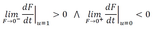 when the switching function is operating under the surface (F < 0); similarly, the switching function derivative must be negative