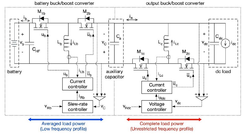 However, the mean current value requested to the batterycould exhibit high frequency transients, e.g. step current transients; therefore, this stage must be controlled to ensure that the mean battery current fulfills the slew-rate restriction required for a safe operation. The buck/boost converter is formed by two Mosfets, M1b and M2b, and by an inductor Lb. Moreover, this stage provides or extracts current to an auxiliary capacitor Ca, which enables to isolate the battery from the load current idc.