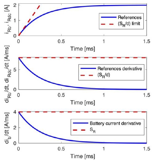 . Finally, the waveforms at the bottom of the figure confirms that the battery current slew-rate is always under the safe limit SR = 4 A/ms, hence fulfilling the first design criterion.