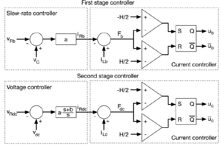 The control of this stage is also based on a cascade structure: an inner controller regulates the inductor current, while an outer controller regulates the load voltage depending on some performance criterion, e.g. maximum voltage deviation.