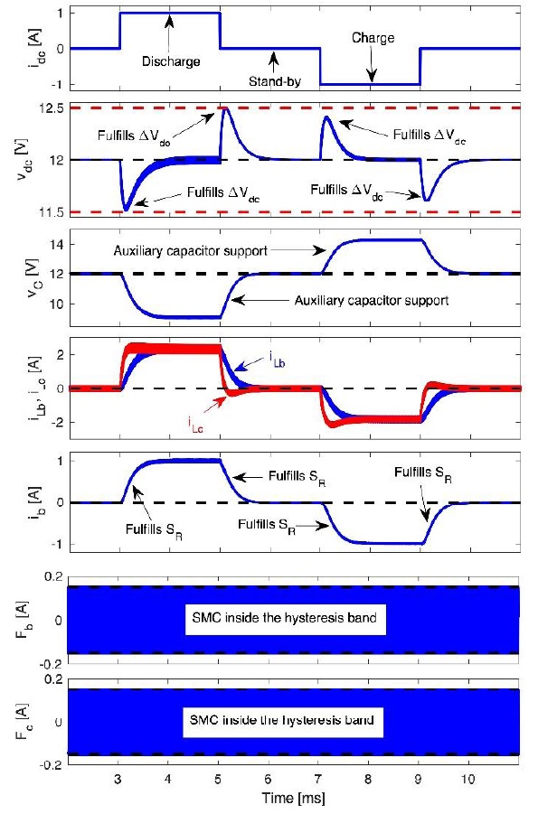 Figure 6 presents the circuital simulation of the complete battery power system performed in PSIM. The simulation considers the battery in the three possible operation conditions: discharge (positive current), charge (negative current) and stand-by (null current). The simulation verifies the correct regulation of the load voltage by fulfilling the maximum deviation limit ∆Vdc = 0,5 V, hence confirming the simulation of Fig. 4. The figure also presents the auxiliary capacitor voltage, where it is observed the support provided by this capacitor, which enables the power circuit to regulate the slew-rate of the battery current. Figure 6 also presents battery current, which fulfills the dynamic restriction of the maximum slew-rate SR; such a restriction is also evident in the maximum slew-rate of iLb, hence confirming the simulation of Fig. 3. The switching functions of both SMC are also reported in Fig. 6, which shows that both converters always operate inside the hysteresis bands: such a behavior verifies the global stability of the SMCs, hence the safe operation of both the battery and the load is guaranteed.