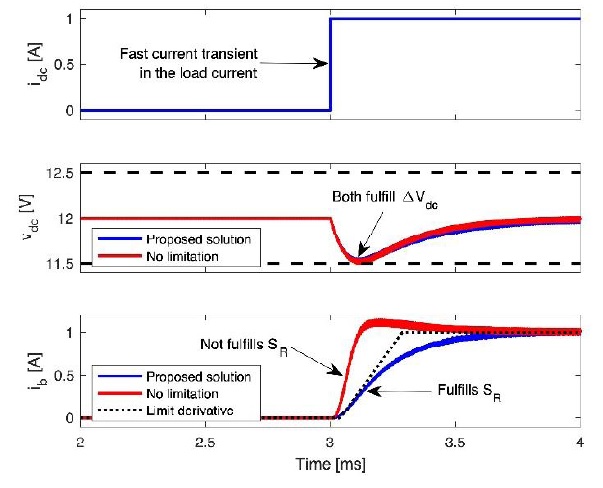 In any case, with the aim of illustrating the improvement provided by the proposed solution, Fig. 7 presents a comparison of the performance of both the proposed and a classical solution. To provide a fair comparison, the classical solution also considers SMC for the current controllers, but such a classical solution does not consider limitation on the current derivative of the battery, which is the case found in literature. The simulation considers a fast current transient in the load current (steplike change), and both the proposed and classical solutions provide a satisfactory regulation of the bus voltage. However, since the classical solution does not include a limitation on the battery current derivative, the slew-rate of the battery current is much higher than the safe limit SR. Instead, the proposed solution fulfills such a limitation, hence protecting the battery. In conclusion, despite both solutions provide an accurate bus voltage regulation, only the proposed solution protects the battery from high-frequency current transients since such a derivative limitation is considered into the SMC design.