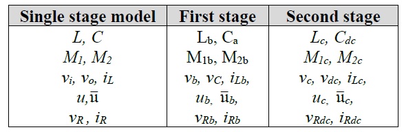 Figure 2 presents the circuital model of a single buck/boost stage, where the input voltage source is vi, the Mosfets are M1 and M2, the inductor is L, the control signals are u and 𝔲̅ = 1 − u, the output capacitor is C and the output voltage is vo. For this general circuit, the reference of the current controller is iR, and the reference of the outer controller is vR. Table 1 presents the correspondence of the parameters and variables of the single stage model with the first and second stages parameters and variables. The CHF capacitor is not considered in the dynamic analysis since it is connected in parallel with the battery, hence its voltage is imposed by the battery and it does not introduce a new state variable.