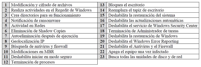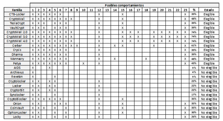 Para las familias seleccionadas, se valoraron 23 comportamientos (tabla 3) que pueden ser identificados a la hora de infectarse [23][24][25][26]. Estos comportamientos pueden dar cuenta de la existencia de un malware en el sistema.