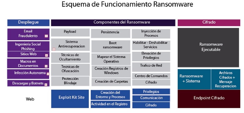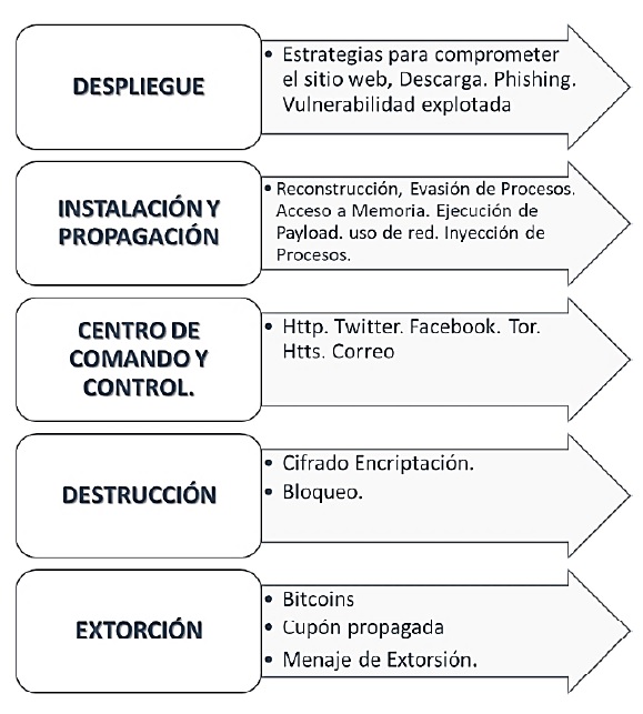 Son varias las fases que ejecuta el malware (figura 1), iniciando con un despliegue por diferentes canales, estableciendo acorde al sistema, cual es la estrategia de infección, para luego pasar al cifrado de la información que encuentre y para finalizar el proceso, genera llaves criptográficas que son enviadas hacia un Centro de Comando y Control (C&C), centro donde opera la administración remota.