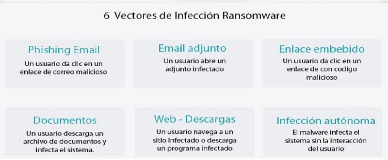Un ransomware puede llegar a la víctiva de diferentes formas (figura 2), los vectores de ataques pueden ser consolidados en la medida que los servicios informáticos estén activos, dichos vectores pueden ejecutarse de acuerdo al comportamiento o falta de conocimiento de empleados para la identificación de archivos maliciosos [13][14][15]. Se destaca dentro de los vectores de ataque lo que esté asociado al correo electrónico, dada la importancia de este servicio en las organizaciones. Otro de los vectores frecuentes es la configuración del auto-run, presente en las memorias o conexiones USB, dada su gran uso a pesar de tener multiples servicios en la nube en donde se pueden compartir recursos (evitando el uso de dichas memorias).