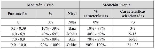 Para poder dar un nivel de impacto estándar acorde a los resultados, se realizó una homologación del porcentaje obtenido vs. la tabla de medición de vulnerabilidades CVSSv3 [47], para lo cual, se hizo una extrapolación del porcentaje de las tablas de comportamiento con respecto a los niveles de impacto de la CVSS (tabla 1), en consecuencia, se seleccionaron aquellos considerados por encima del 39%, esto es, los que tienen una relevancia medio, alto y críticos. La escala CVSS fue seleccionada dado su nivel de madurez, su fortaleza en la medición y la asociación directa con la afectación en las plataformas de manera técnica, con ello, poder contar con un esquema de medición más estándar.