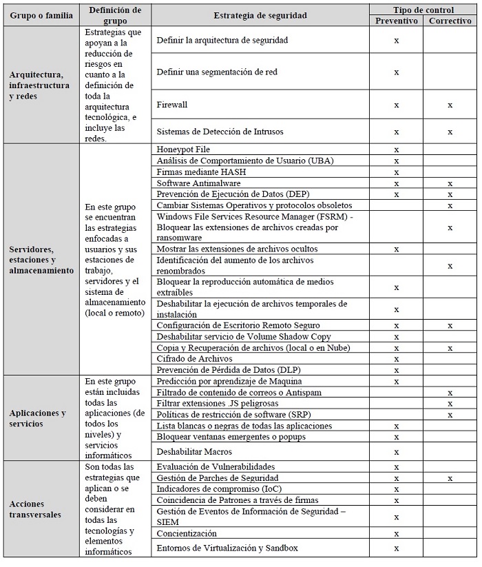 En la tabla 5 se observan diferentes estrategias de control que se pueden implementar en las diferentes plataformas tecnológicas, estas, fueron segmentadas por grupos o familias representativas como se indicó. Cada estrategia fue catalogada si es preventiva o correctiva frente a una posible infección por ransomware.