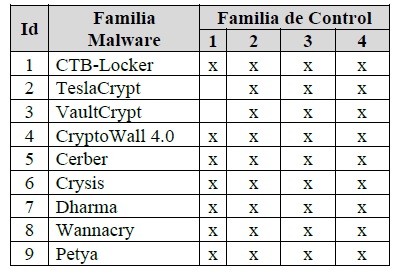 En consideración que se han seleccionado 9 malware de gran impacto y existen 4 familias de controles, se establece una propuesta (tabla 6) para contrarrestar las amenazas y que pueden ser aplicados en todas las organizaciones, de forma preventiva o correctiva. Dichos controles se basan considerando las 4 familias de controles, en el mismo comportamiento de las familias de ransomware, los resultados de las pruebas controladas y las recomendaciones de varios autores. Las familias de controles permiten establecer una estrategia global en la reducción de riesgos: (1) Grupo Arquitectura, infraestructura y redes, (2) Grupo Servidores, estaciones y almacenamiento, (3) Grupo aplicaciones y servicios, y (4) Grupo acciones transversales. En ese sentido, por ejemplo, el malware TeslaCrypt en su forma de infección y actuación, no considera las funciones de red como la geolocalización, desactivar servicios de red o de actualización, por lo cual, la familia de controles 1 no aplicaría como recomendación, es el mismo caso del malware VaultCrypt.