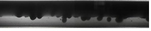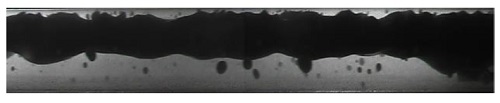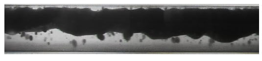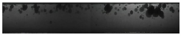 Para el patrón de flujo disperso (gotas de aceite en agua), se observa en Figura 6, imagen de la tomografía obtenida por WMS y en la figura 7 la imagen grabada por la cámara de alta velocidad. En la tomografía obtenida se pueden ver en la región central del tubo gotas de aceite de color rojo que corresponde a las gotas de color negro presentes en la imagen obtenida por la cámara de alta velocidad a 1000 cuadros por segundo.
