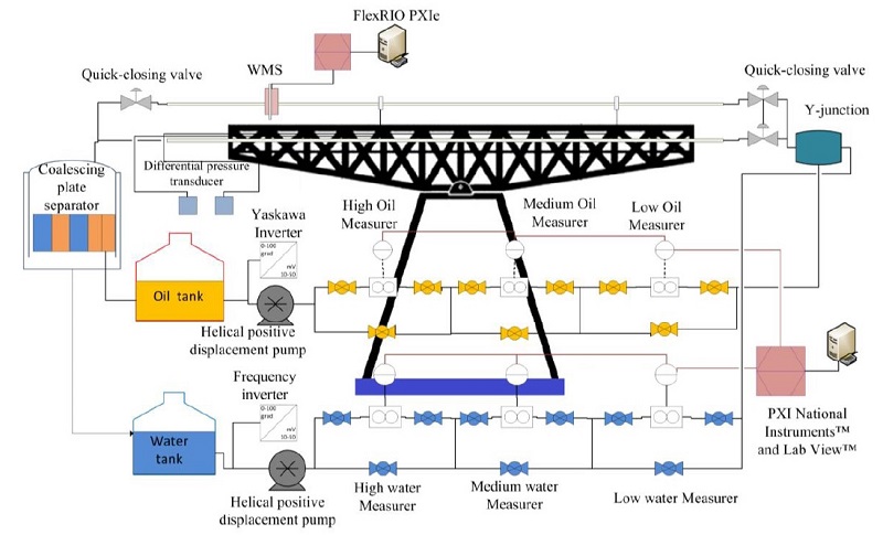 El circuito de flujo multifase se presenta esquemáticamente en la Figura 1. Las pruebas se llevaron a cabo en una tubería de vidrio de borosilicato de 25.4 [mm] de diámetro interno y 12 [m] de longitud. Se usaron agua y aceite (828 [kg / 𝑚3 ] de densidad y con viscosidades de 200 [cP] y 60 [cP]) como fluidos de prueba. El aceite y el agua se almacenan individualmente en tanques de plástico. Ambos fluidos son bombeados, separadamente, a la sección de prueba por una bomba helicoidal de desplazamiento positivo (Weatherford ® LabVIEW® 2WHT53), que fue controlada por un controlador de frecuencia variable a través de la plataforma LabVIEW.