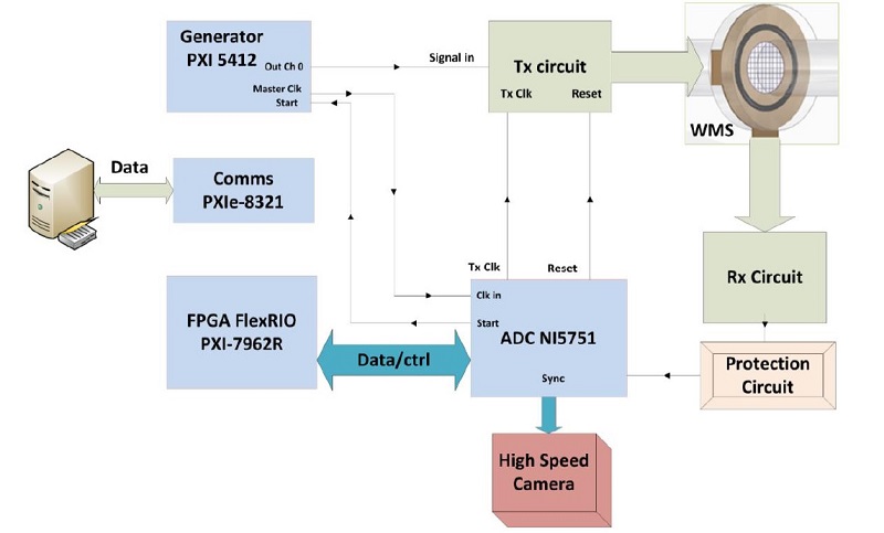 La Figura 3 muestra un diagrama de cableado para el sistema WMS. El núcleo del sistema es un sistema de adquisición de datos basado en la tecnología FlexRIO de National Instruments ™. El sistema consta de una PC de alto rendimiento, un chasis industrial (PXIe-1071), una caja de acondicionamiento de señal (circuitos Tx y Rx) y una caja de protección de circuito. En el chasis PXIe-1071 se encuentran el generador de señal (PXIe-5412), FlexRIO (PXIe-7962R), el convertidor analógico-digital (ADC, NI 5751) y la tarjeta de comunicaciones PXIe (PXIe-8381). El NI 5751 ADC se conecta directamente al FlexRIO PXIe-7962R. La conexión de estas dos placas al exterior se realiza a través de dos bloques de conexión. Un bloque de conexión (SMB-2147) permite la conexión de canales analógicos. Un segundo bloque, el SMB-2148 permite la conexión de los canales de entrada y salida digital. Los canales digitales provienen directamente de la tarjeta FlexRIO PXIe-7962R y atraviesan el NI 5751 sin ningún tipo de empaque. La caja de acondicionamiento de señal está compuesta por dos placas, el circuito de transmisión y el circuito de recepción, [10].