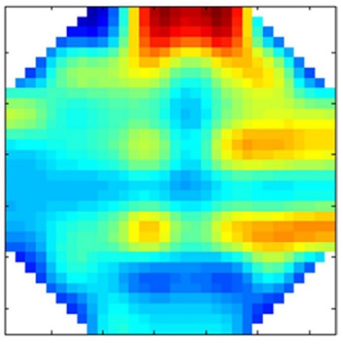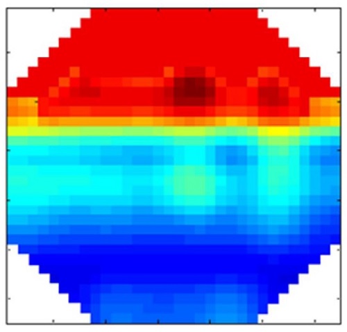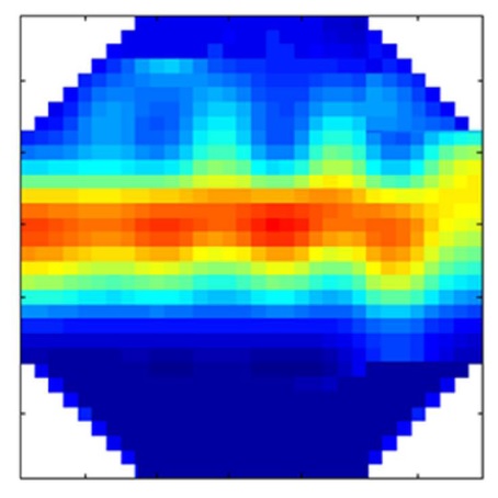 Una ilustración de la tomografía de la sección transversal del tubo obtenida por el sensor de malla de alambre (WMS) puede ser apreciada en la Figura 4 para el patrón de flujo bifásico anular, el cual se genera para tasas de flujo altas. En la figura 5 puede ser observada una instantánea de la vista lateral del patrón de flujo registrado por la cámara de alta velocidad, obtenida por la cámara de alta velocidad a 1000 cuadros por segundo. La tomografía muestra buena consistencia entre la imagen grabada por la cámara en comparación con la tomografía obtenida por WMS, el color rojo representa (aceite) en la parte central y el color azul (agua) en la parte inferior y superior del tubo, con una región degradada (diferentes colores), donde ambas fases están presentes, en la interfaz (mezcla de flujos).