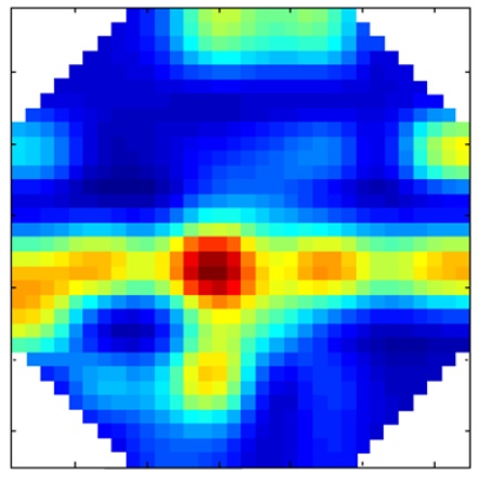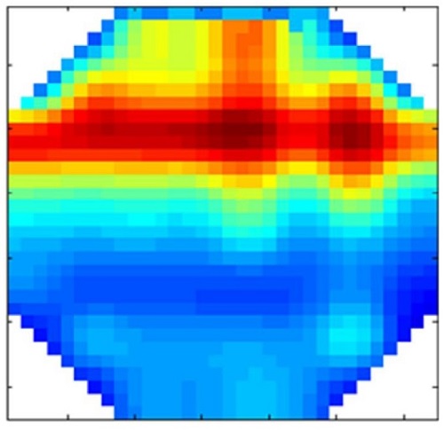 La Figura 10 muestra la tomografía obtenida por el sensor WMS para el patrón de flujo anular, se observa en color rojo que representa aceite, forma un núcleo centrado en la parte superior del tubo, prácticamente creando un anillo de ahí deriva su nombre de patrón anular, el cual muestra cualitativamente una buena tomografía en comparación con la imagen grabada por la cámara de alta velocidad, Figura 11. En la tomografía, se observa una cierta región central solo con aceite en color rojo formando un anillo y la región de los bordes con colores degradados de color azul equivalente al agua o mezcla de agua y aceite.