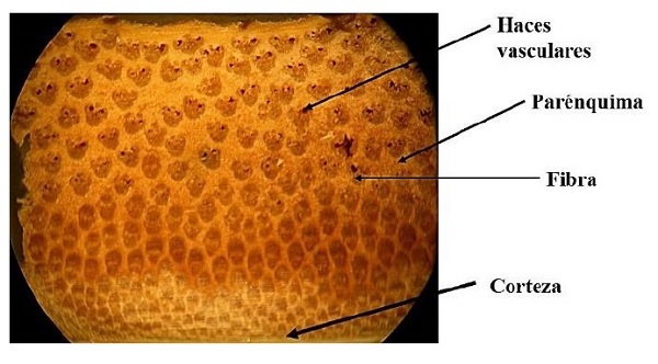 En Colombia crece de forma natural una especie de bambú gigante llamada Guadua angustifolia Kunth, la cual se ubica en mayor densidad a lo largo de la región de la cordillera central [27] con un alto contenido de biomasa tanto por unidad como por hectárea cultivada [28]. Es un bambú que ha sido catalogado como uno de los bambúes con mejores propiedades mecánicas, y ha sido usado ampliamente en el campo de la construcción civil como elemento estructural [29], [30], [31]. La Guadua angustifolia Kunth presenta haces vasculares también llamados de doble roto (Figura 1), la distribución de fibras va en aumento desde la parte media de la pared hasta la corteza. Este aumento en concentración de fibras concede propiedades mecánicas únicas en este tipo de bambúes. Dentro de la caracterización anatómica de las especies de bambú, la guadua está catalogada como tipo IV o Double-broken debido a la distribución de haces vasculares [32]. De acuerdo a lo anterior, la Guadua angustifolia Kunth podría ampliar sus usos en la fabricación de nuevos productos de alto impacto económico como lo son los compuestos de partículas de bambú.
