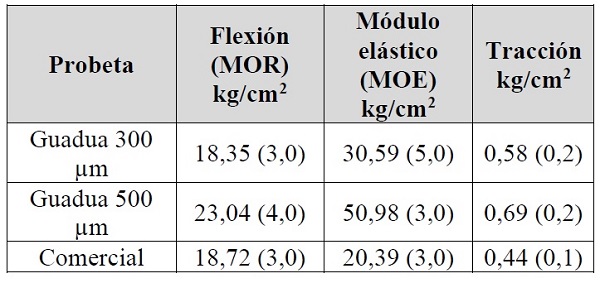 La tabla 1, muestra los resultados obtenidos en pruebas mecánicas de flexión y tracción en compuestos de guadua y comercial. En los resultados se puede observar que existe una diferencia en el módulo de ruptura, modulo elástico y tracción de los compuestos de guadua con respecto al comercial.